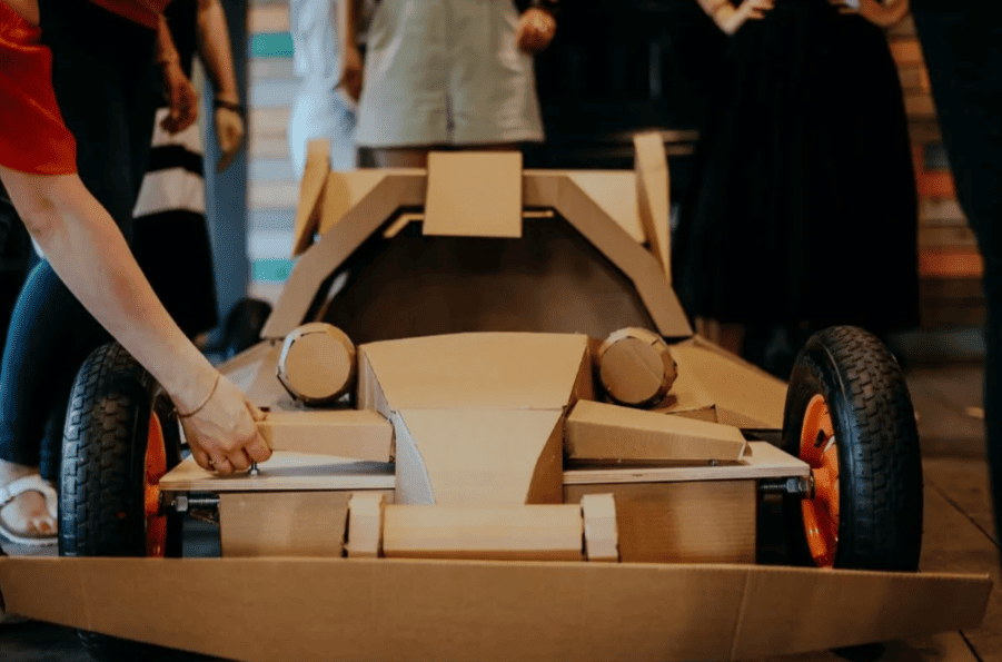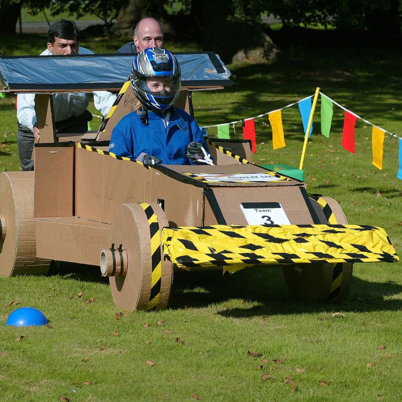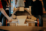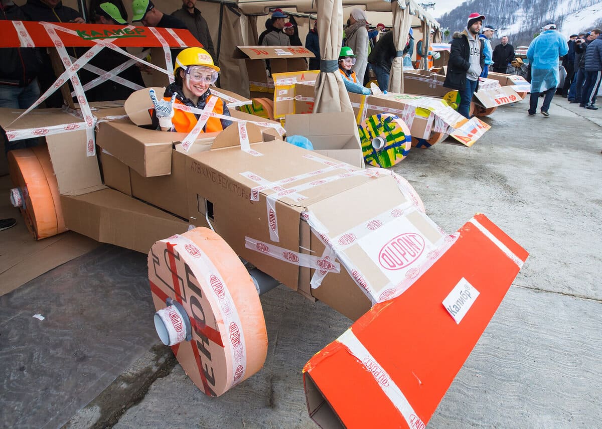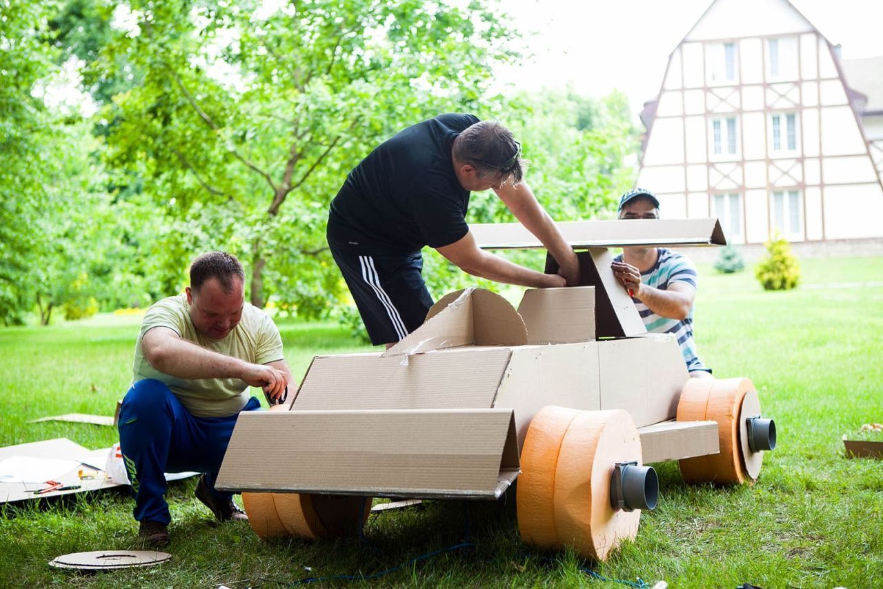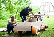 Участники получают необходимый реквизит для моделирования будущего спортивного автомобиля. Теперь болид нужно собрать таким образом, чтобы он мог катиться и выдерживал бы вес одного участника. В помощь смекалка, находчивость и умелые руки.