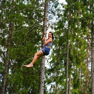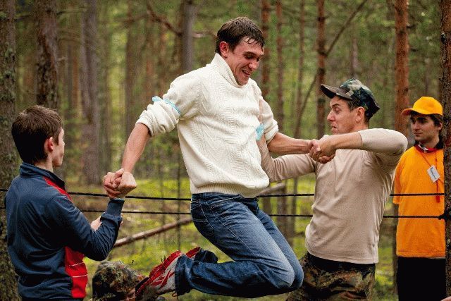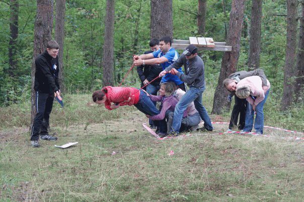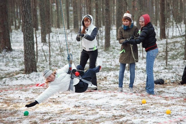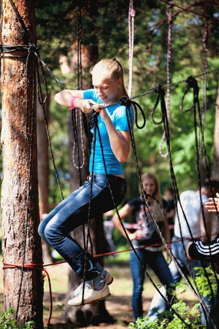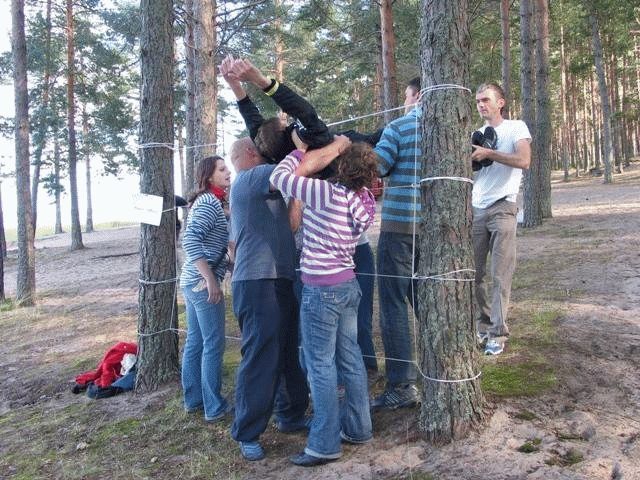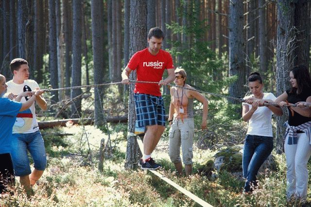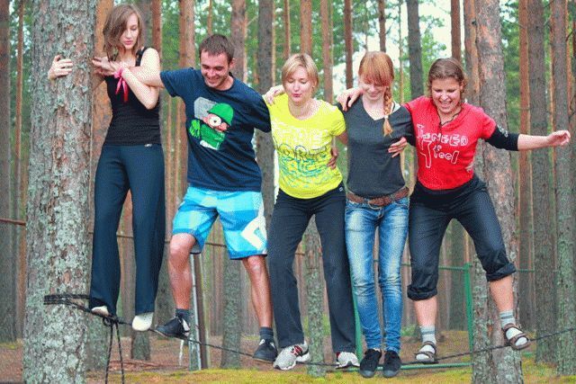 Между деревьями натянута веревка. Команде предстоит пройти по веревке, организуя перила из самих себя, держась руками друг за друга и за деревья. Необходимо на веревку вставать по очереди. Нельзя помогать с земли. Если падает хотя бы 1 участник – начинаем с начала.