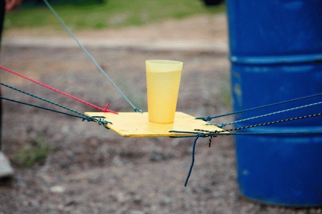 Команде предстоит пронести стакан, наполненный водой, на подносе по определенному маршруту. При этом держаться разрешается только за петли на концах веревок, привязанных к подносу (допускается короткий перехват нагруженной веревки во время преодоления препятствия). Команда возвращается на старт, если: