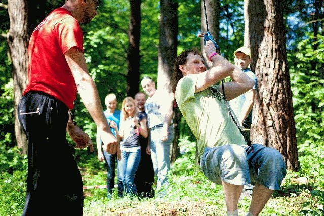 Веревочные курсы – комплекс спортивных упражнений, проводимых для групп людей, с целью повышения командного духа. На Веревочном курсе используется альпинистское снаряжение: специальные веревки, карабины – поэтому он и носит такое название. Все веревочные курсы, как правило, проводится за чертой города, в лесных массивах. Чтобы до конца понять, что такое веревочный курс, приглашаем Вас в наш фотоальбом.